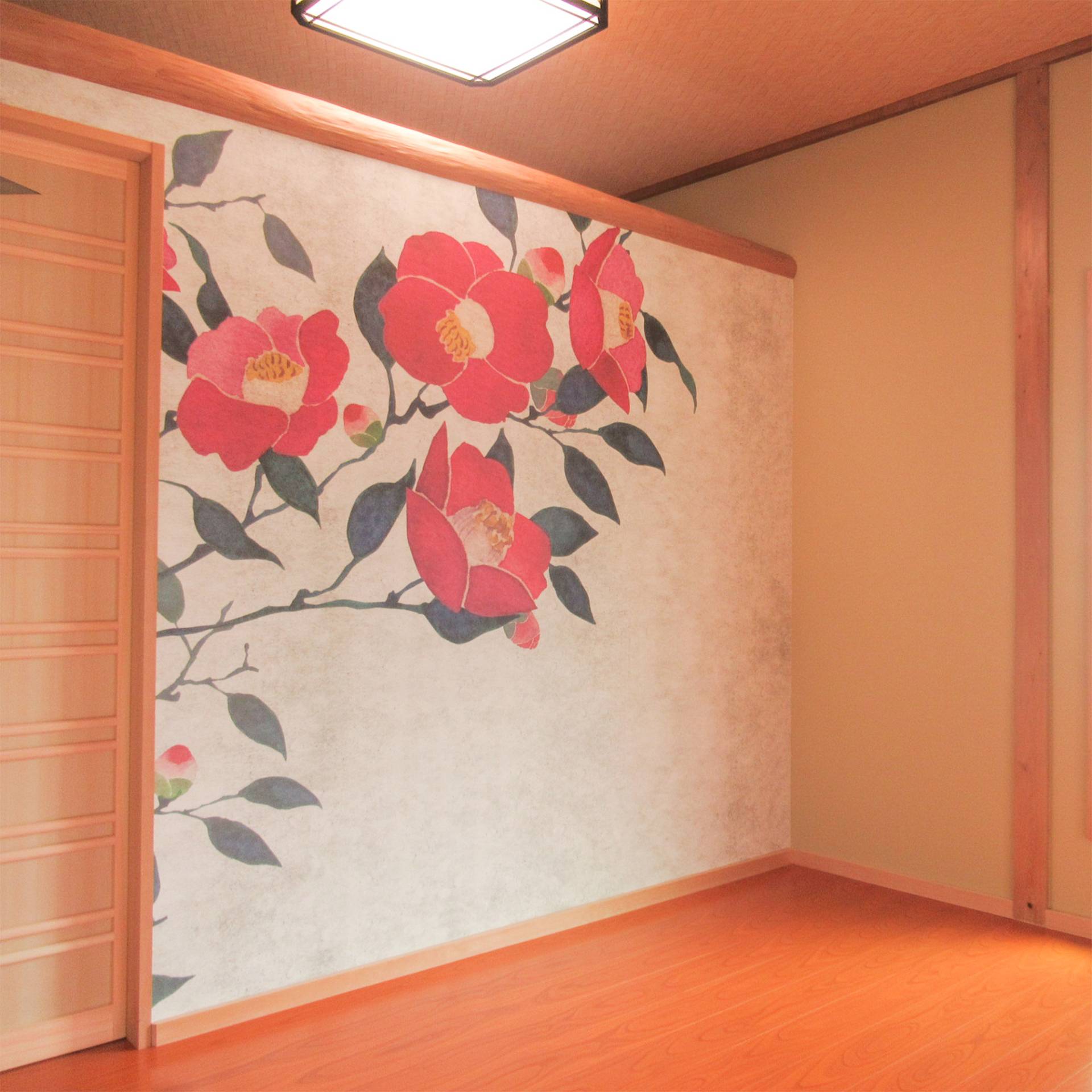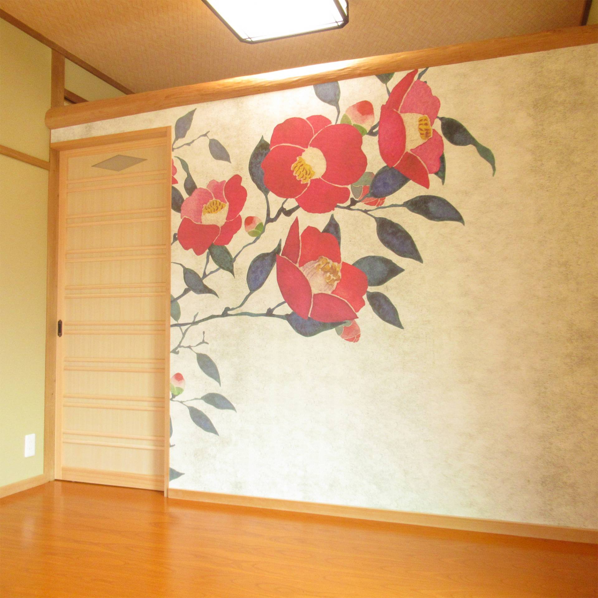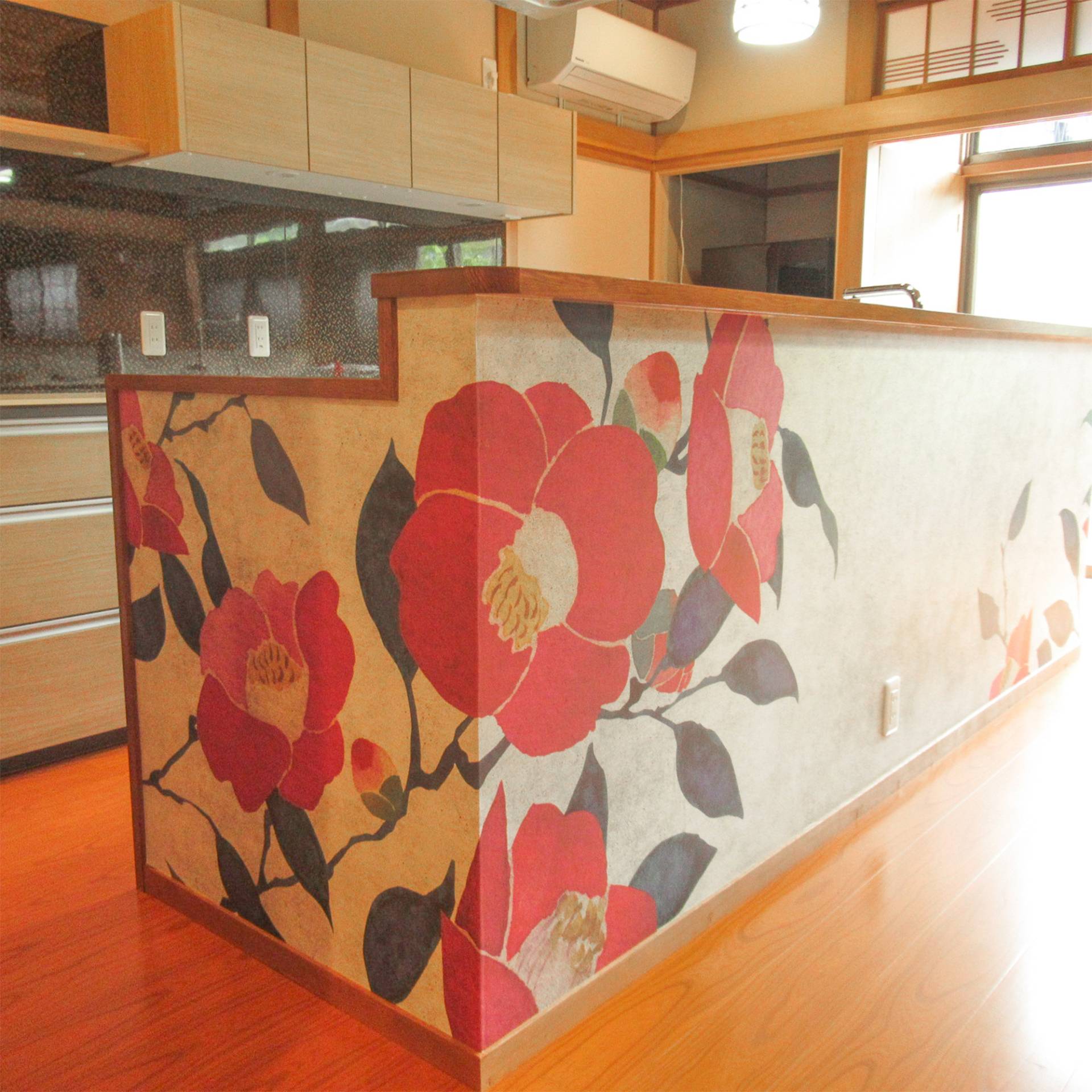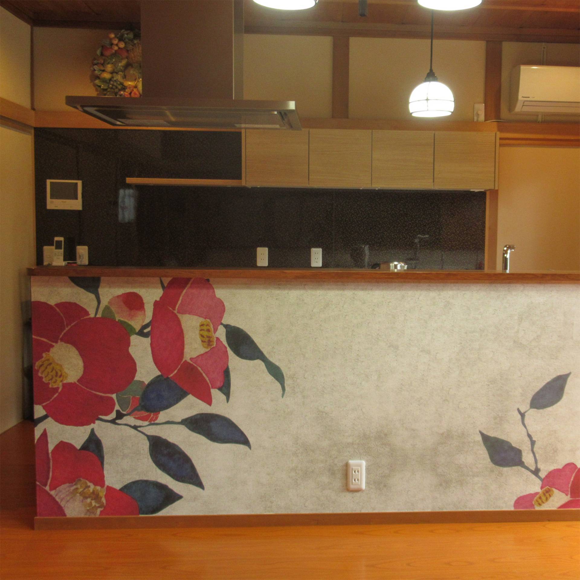 大きなつばきのデザインを壁面とキッチンにご使用頂きました。