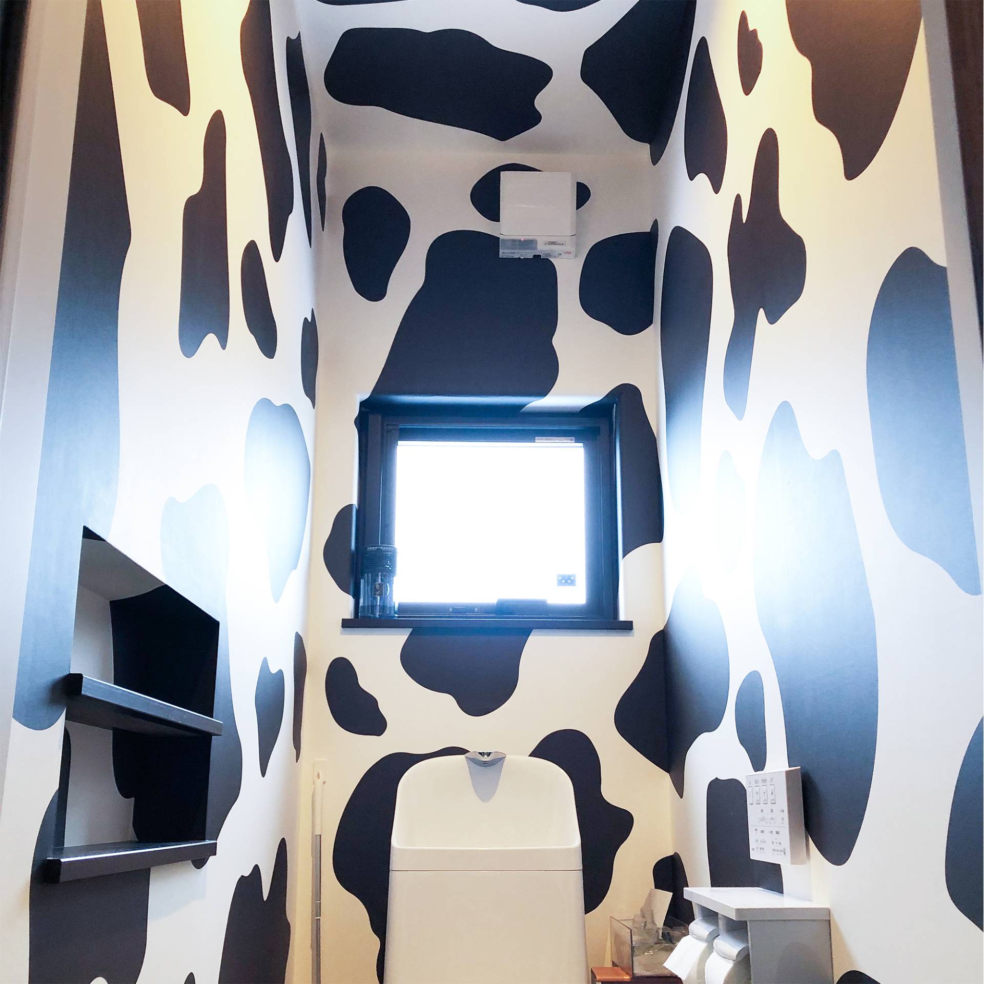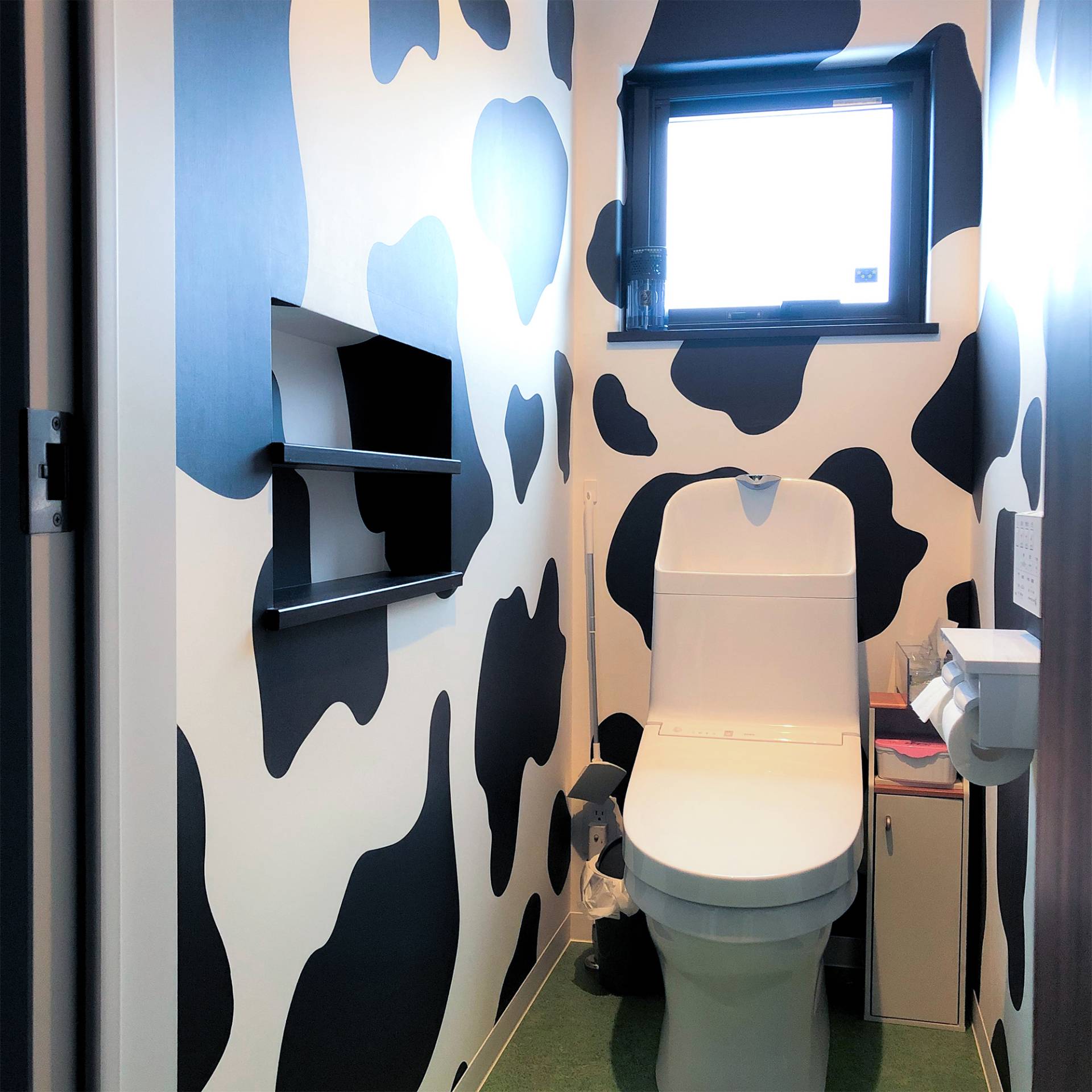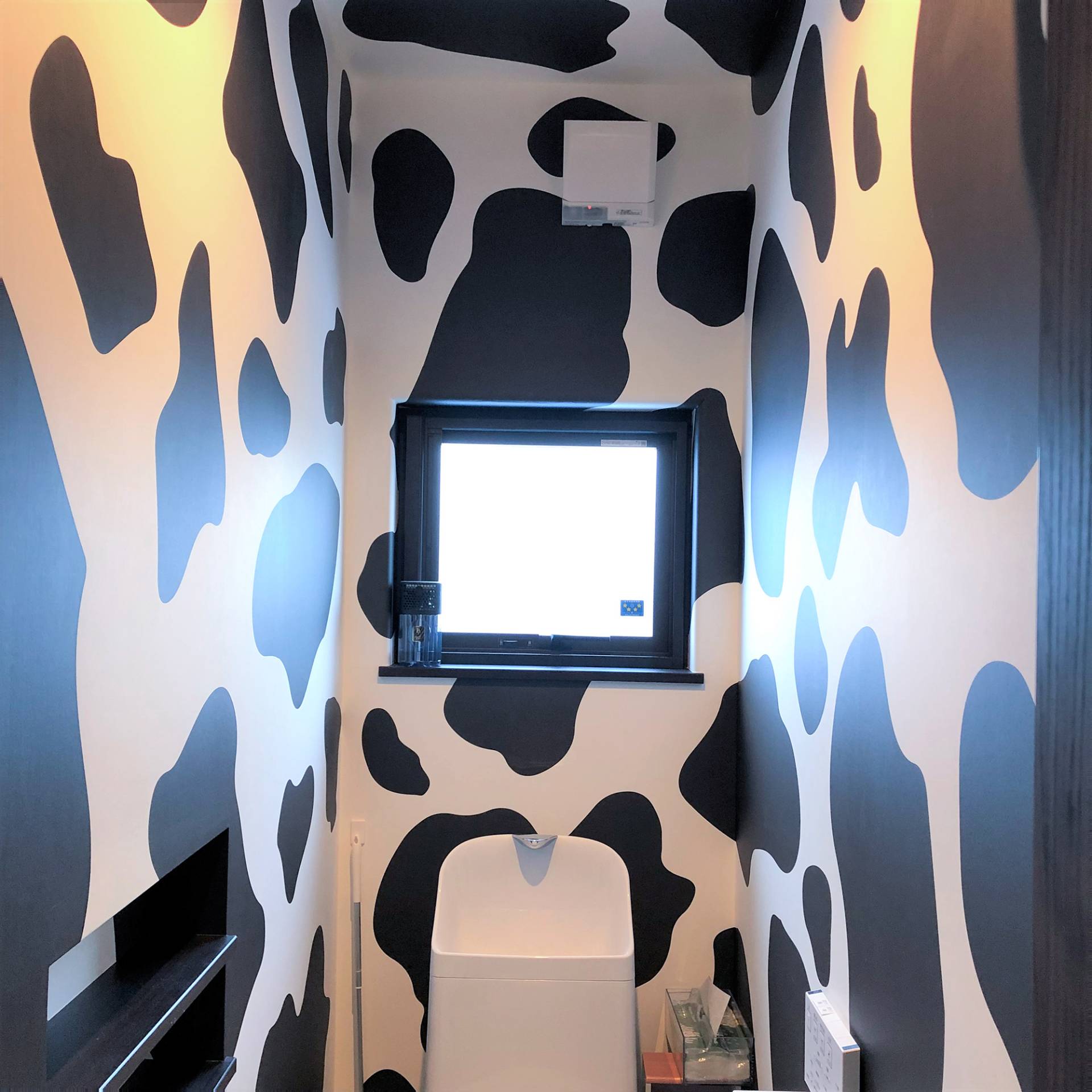 住宅のトイレの壁面と天井に牛柄のクロスをご使用頂きました。