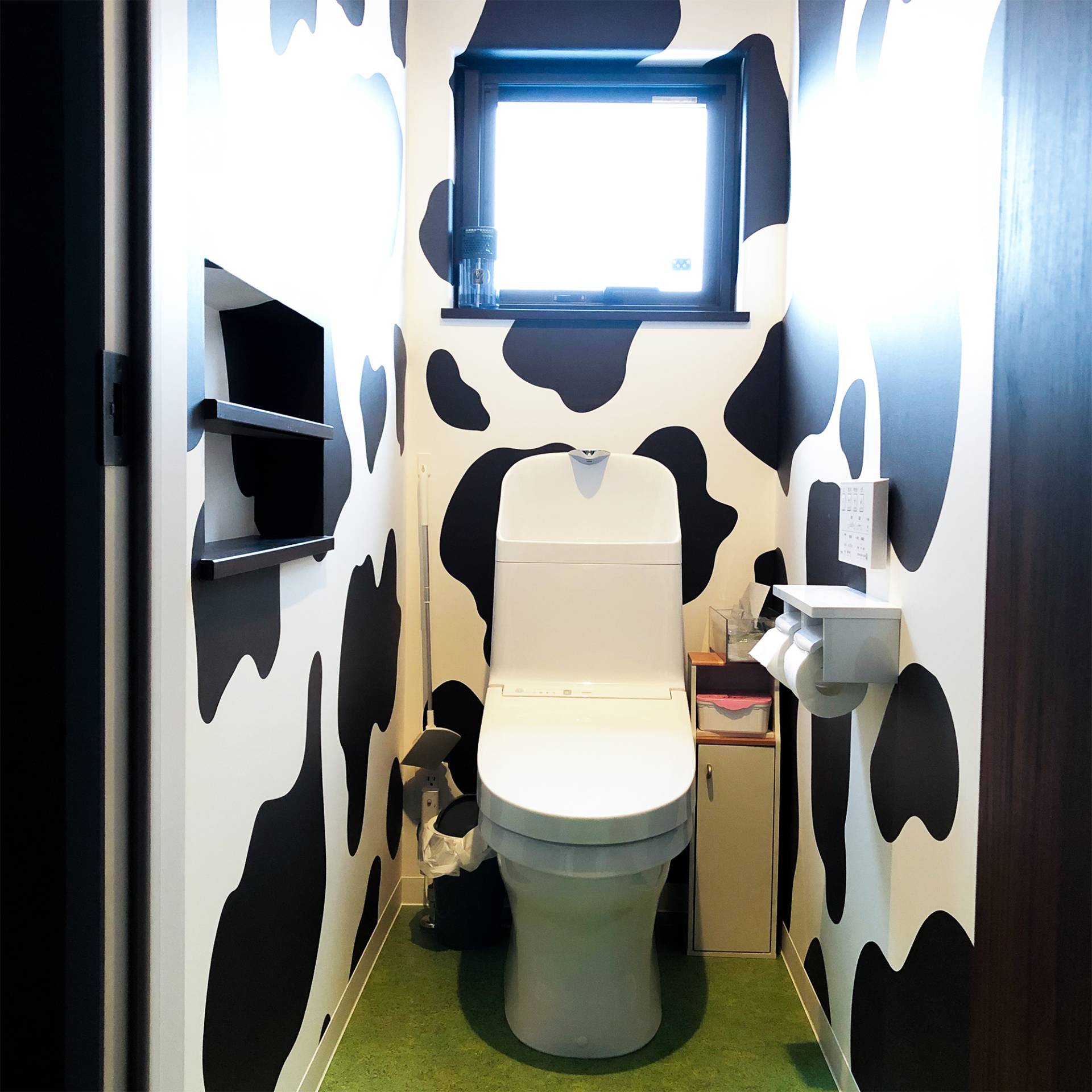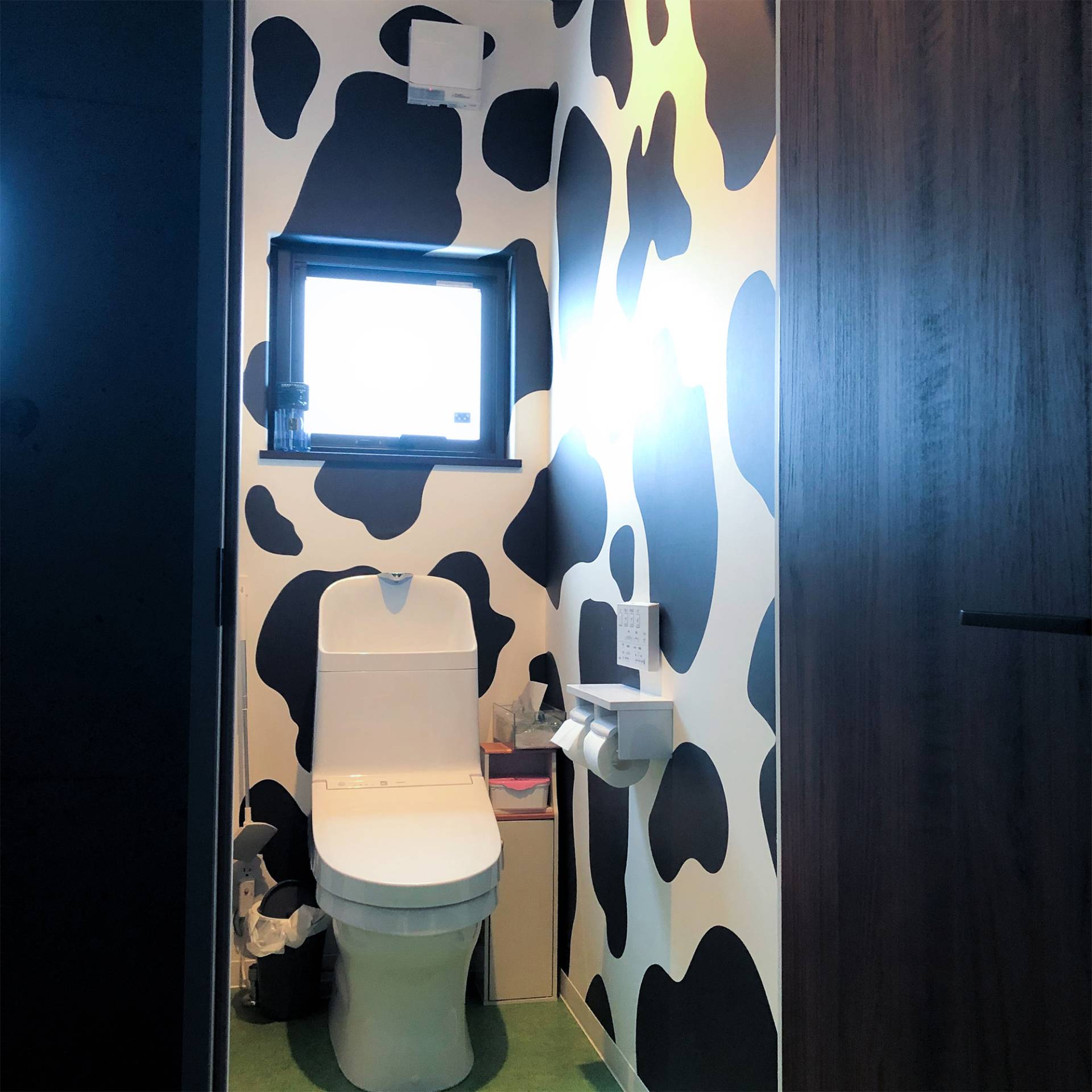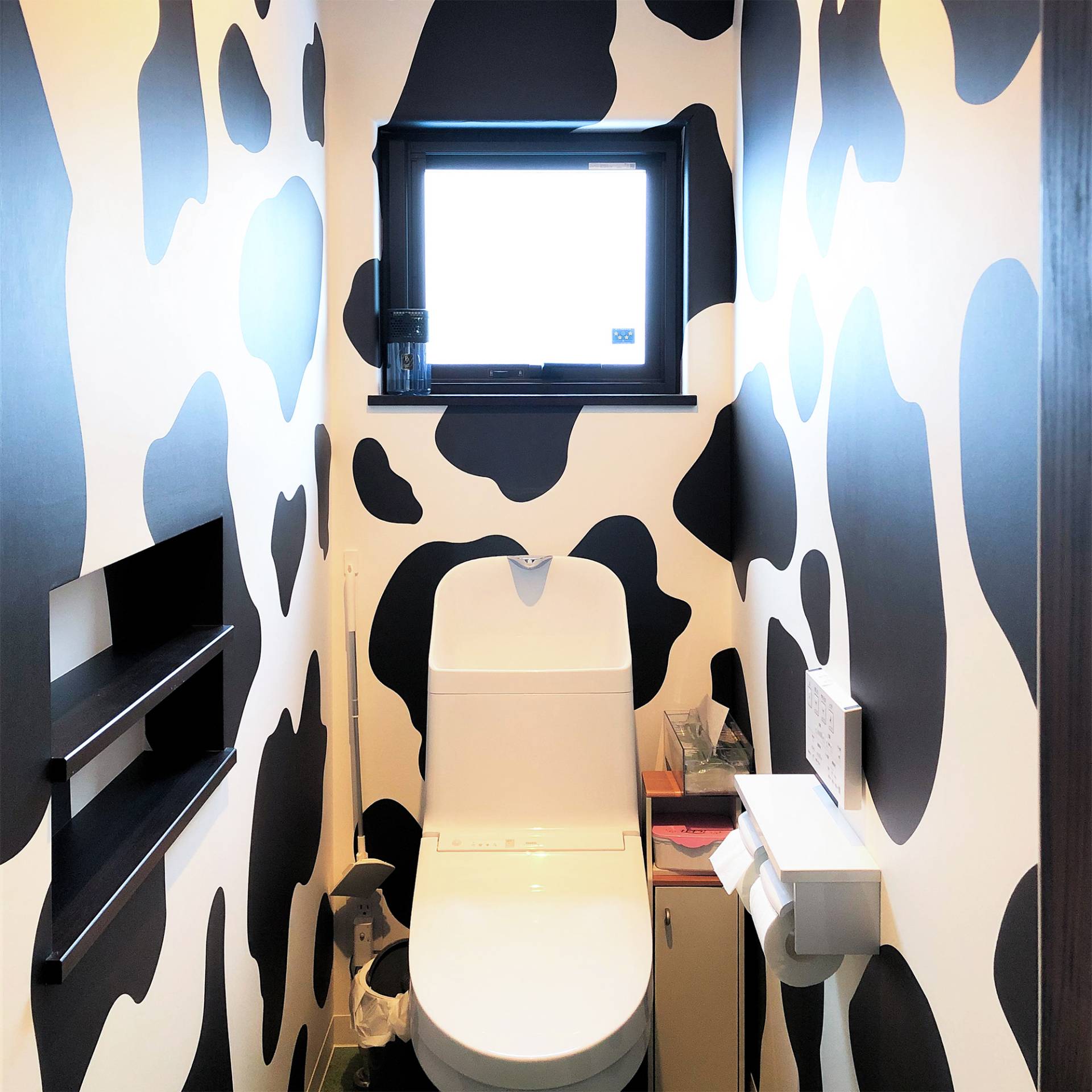 住宅のトイレの壁面と天井に牛柄のクロスをご使用頂きました。