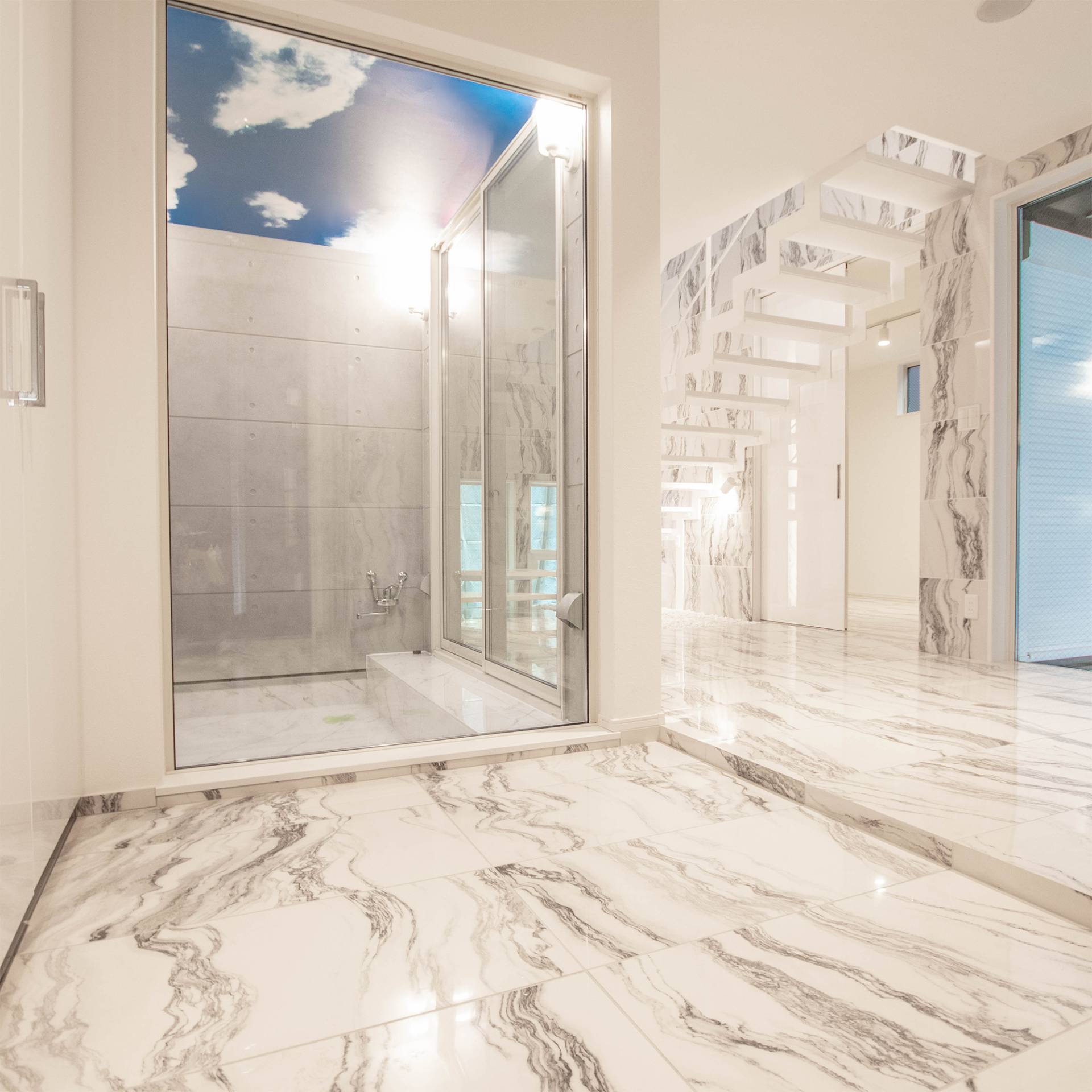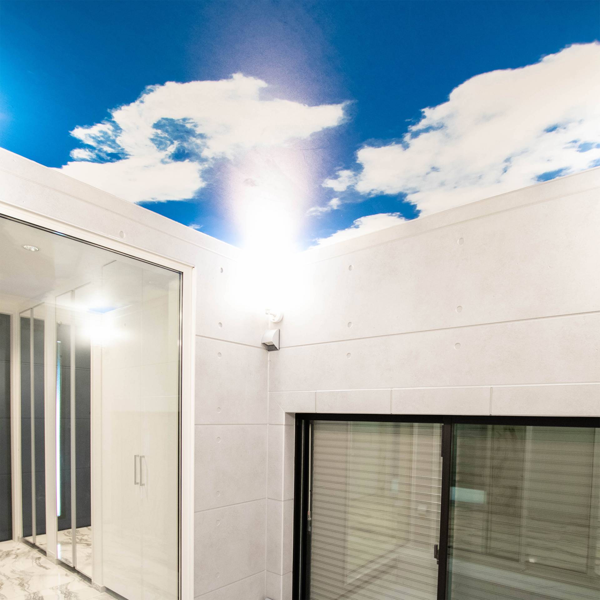 モノトーンの空間に冴えるような空のブルーがアクセントとして効いておりますね!