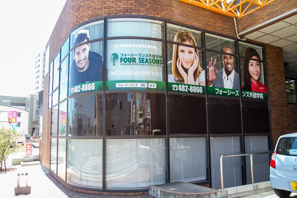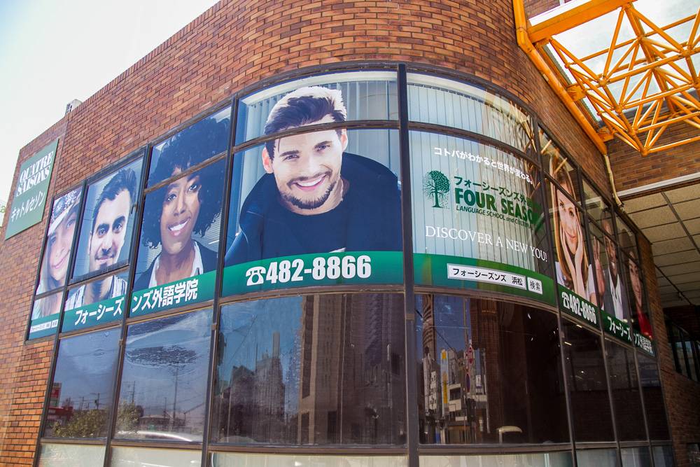 15を超える世界の言語を教える外語学院のガラスに、大きくわかるように