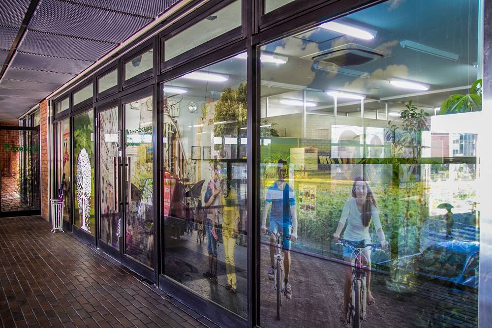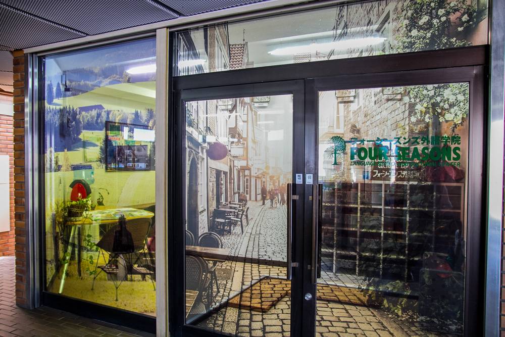 ガラスフィルムをオリジナルデザイン。屋内は、学院内が見えつつ世界の風景が