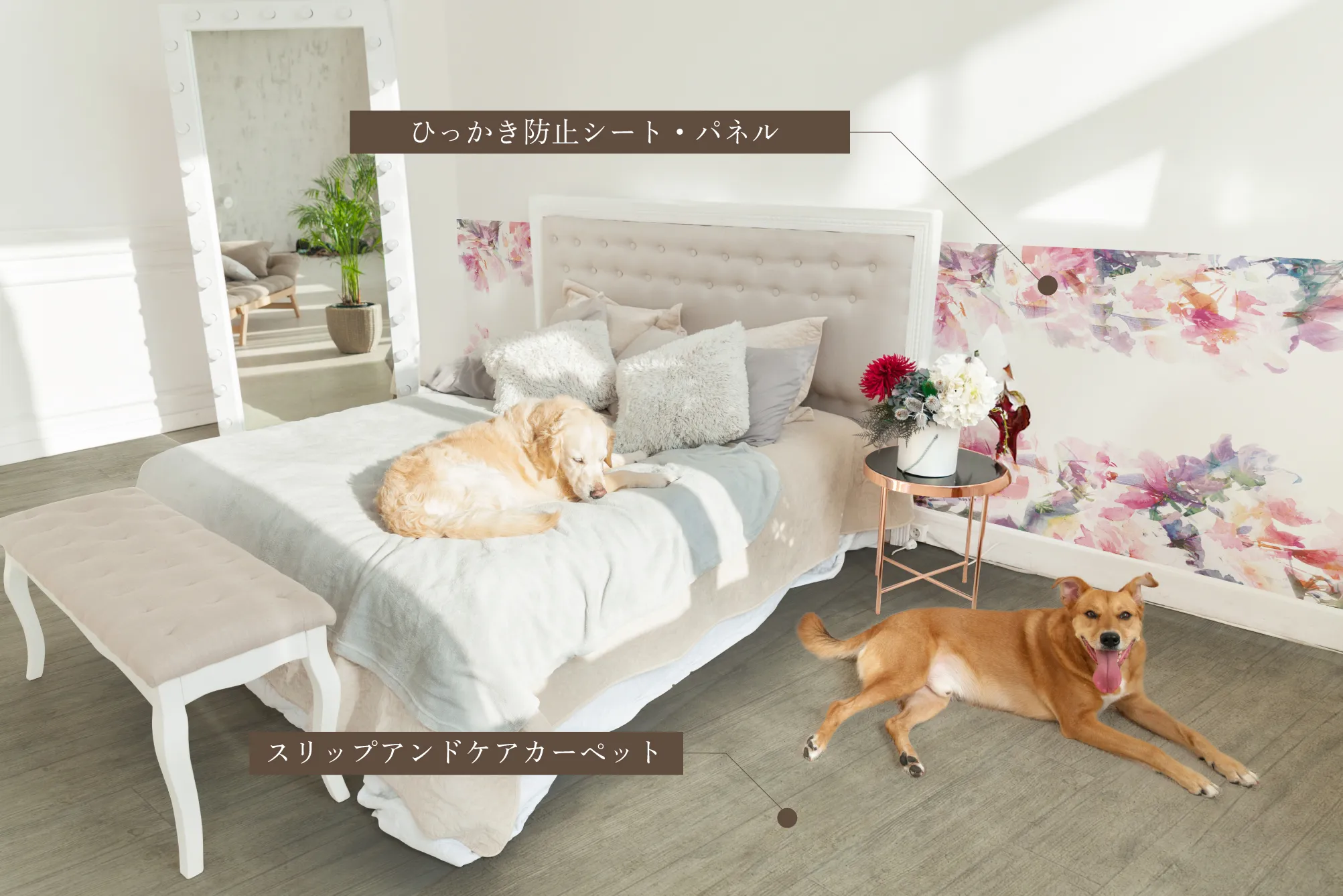 「ひっかき防止シート・パネル」「スリップアンドケアカーペット」で大切なペットと寄り添う暮らしをオシャレに演出。